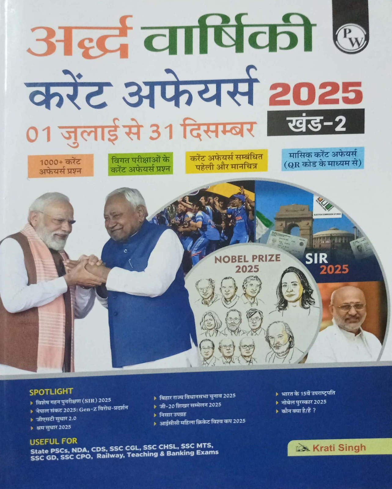 Ye book 2025 ke dusre half (July se December) ki sabhi mahatvapurn ghatnaon ka ek sampurn sankalan hai. Isme National aur International news, sports, appointments, aur schemes ko bahut hi saral bhasha mein samjhaya gaya hai. Ye book State PSCs, SSC, Railway, aur Banking exams ki taiyari karne waale students ke liye ek must-have resource hai. Isme latest Nobel Prize 2025 aur Bihar Vidhan Sabha chunav jaise topics ko vishesh roop se cover kiya gaya hai.