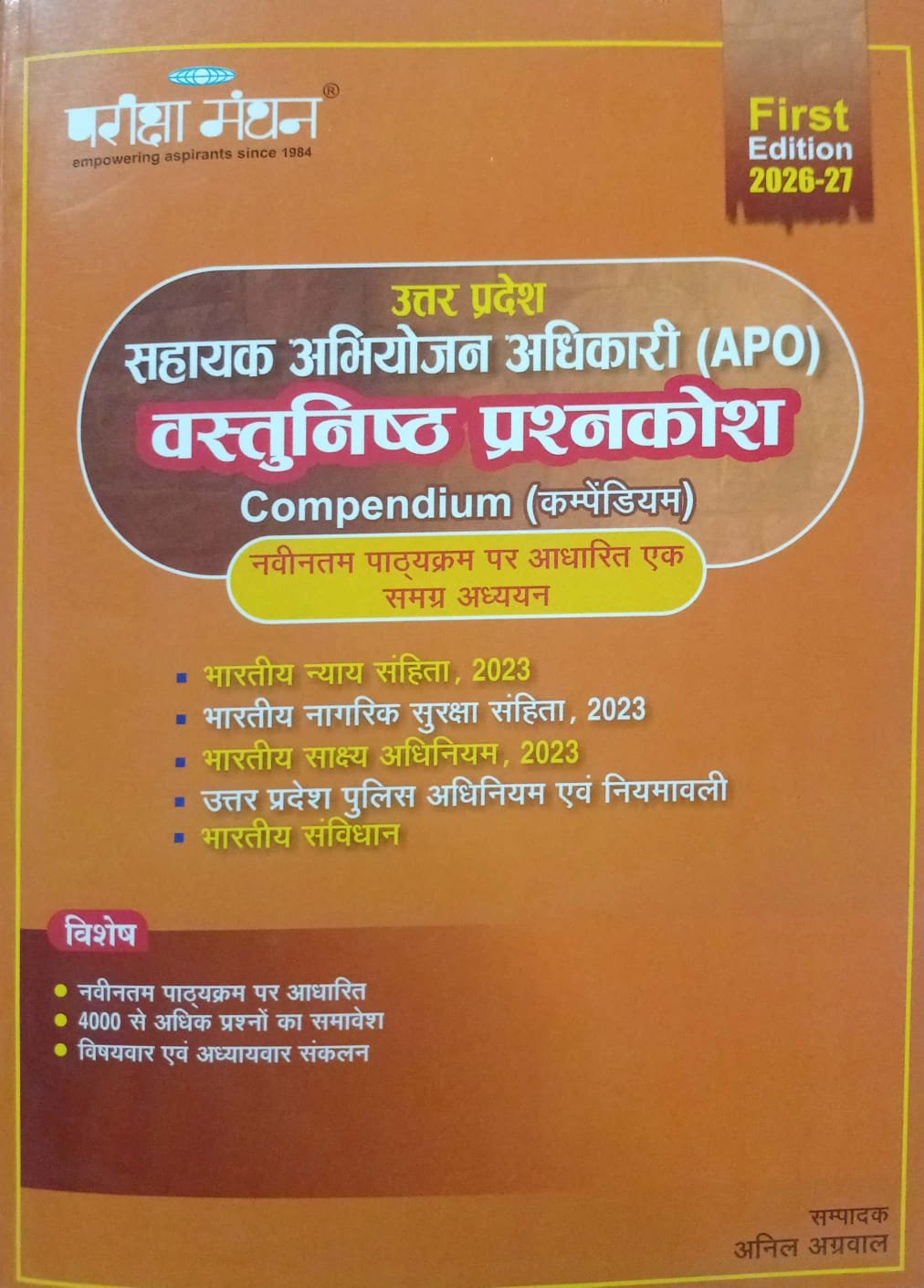 Uttar Pradesh Sahayak Abhiyojan Adhikari (APO) VastuNishth PrashnKosh Compendium 2026–27 is a comprehensive objective question bank specially designed for candidates preparing for the UP APO examination. Published by Pariksha Manthan and edited by Anil Agrawal, this book is based on the latest syllabus and includes more than 4000 objective questions for thorough practice. The book covers important legal subjects including Bharatiya Nyaya Sanhita 2023, Bharatiya Nagarik Suraksha Sanhita 2023, Bharatiya Sakshya Adhiniyam 2023, Uttar Pradesh Police Act & Rules, and the Constitution of India. It helps aspirants strengthen their conceptual understanding and improve exam-oriented preparation.